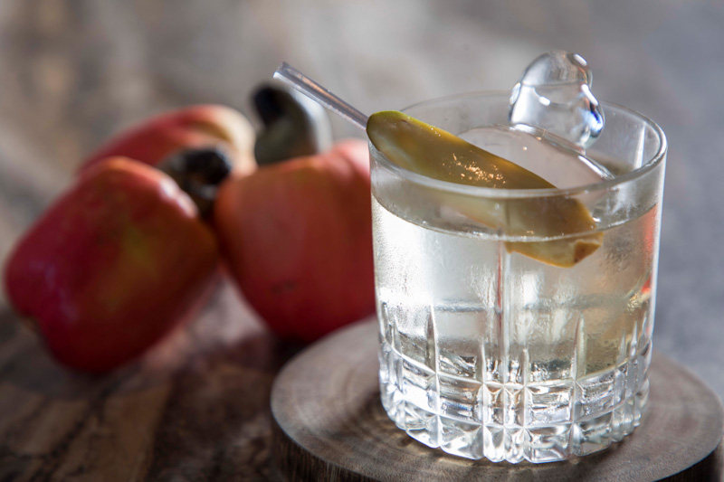 O coquetel de assinatura da casa, Meu Caju (R$ 52), elaborado com gin infusionado com caju, pode ser apreciado com a sugestão de acompanhamento de steak tartare picado na faca, servido com picles, cebola roxa, alcaparras, ovas e batata chips (R$ 108), reforçando a identidade do bar e sua relação com a cidade onde está inserido.
