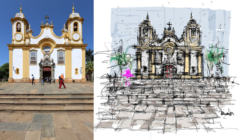 Como principal desafio, Basiches ressalta o nível de detalhamento da arquitetura neoclássica e barroca que compõe a cidade. Entretanto, ele se permitiu exteriorizar sua técnica pessoal de ‘rabiscar’ sobre a foto. “Essa foi a maneira como interpretei a combinação entre o colorido, os brilhos e os detalhes tão ricos das fotos feitas por Mariana para retratá-las com um olhar semelhante, porém de uma forma mais livre”, refere-se sobre o processo de desenhar.
