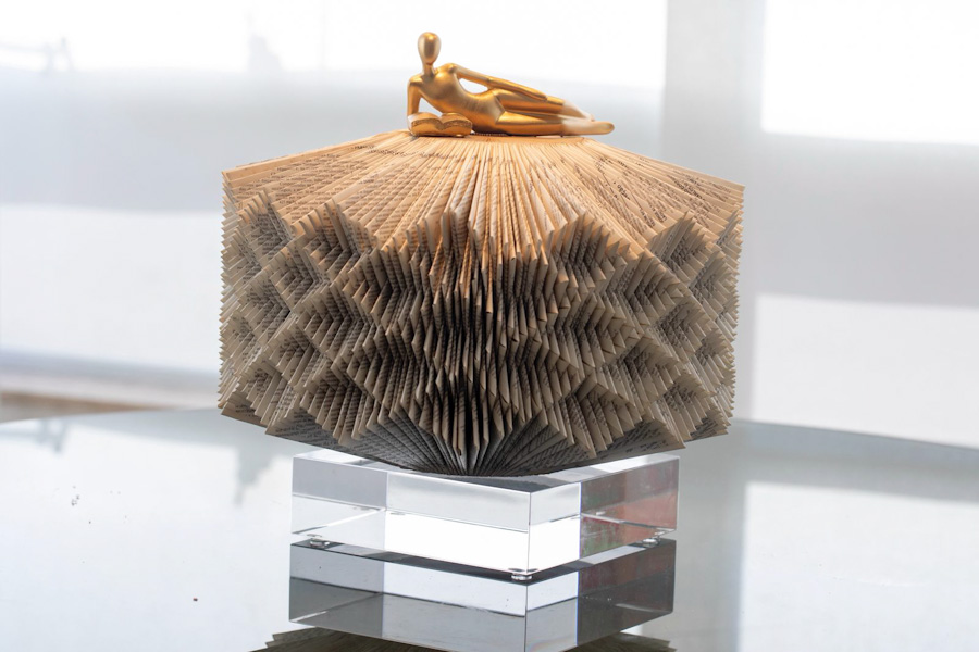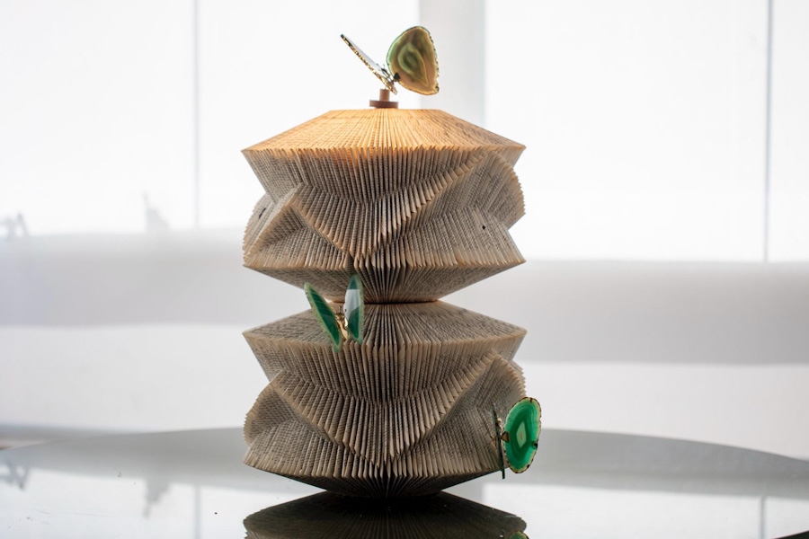 Ao seu lado, Eloisa Ugolini apresenta sua pesquisa artística em torno do livro como objeto poético e tridimensional, transformando páginas em esculturas delicadas e expressivas, que dialogam com arquitetura, arte, design e decoração.