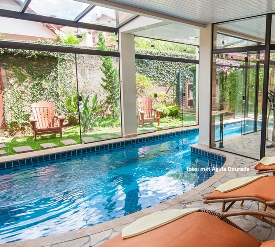 A piscina, por sua vez, com hidro-spa de água aquecida ao centro, é um convite para momentos de bem estar e relaxamento, saboreando um drink e contemplando a linda paisagem da natureza ao redor.
