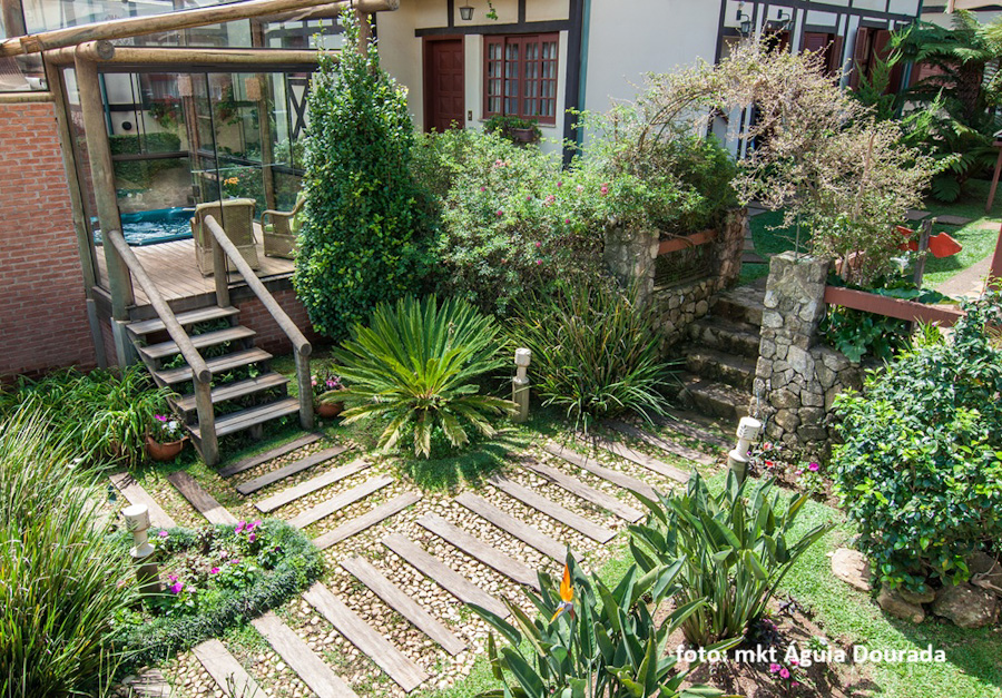 Jardins floridos cercam os caminhos que levam os hóspedes ao charmoso lounge da casa sede, bar e restaurante, que também é aberto para visitantes a partir de reservas.