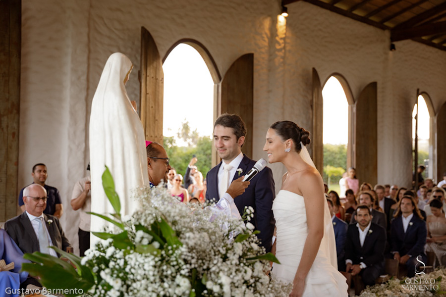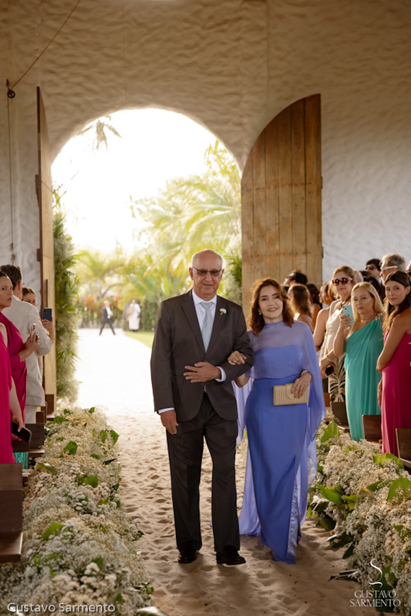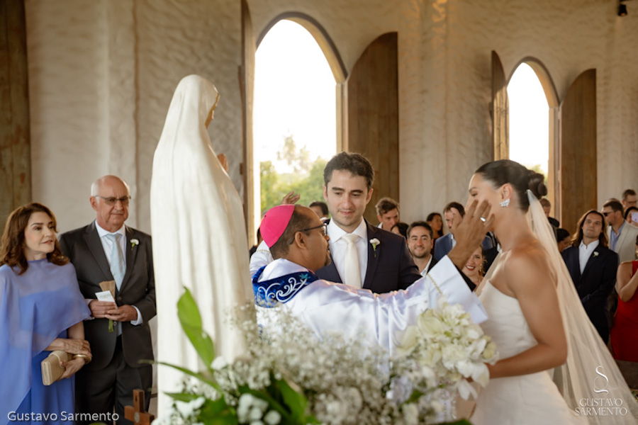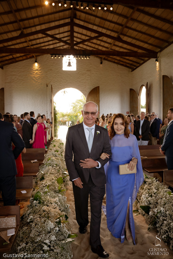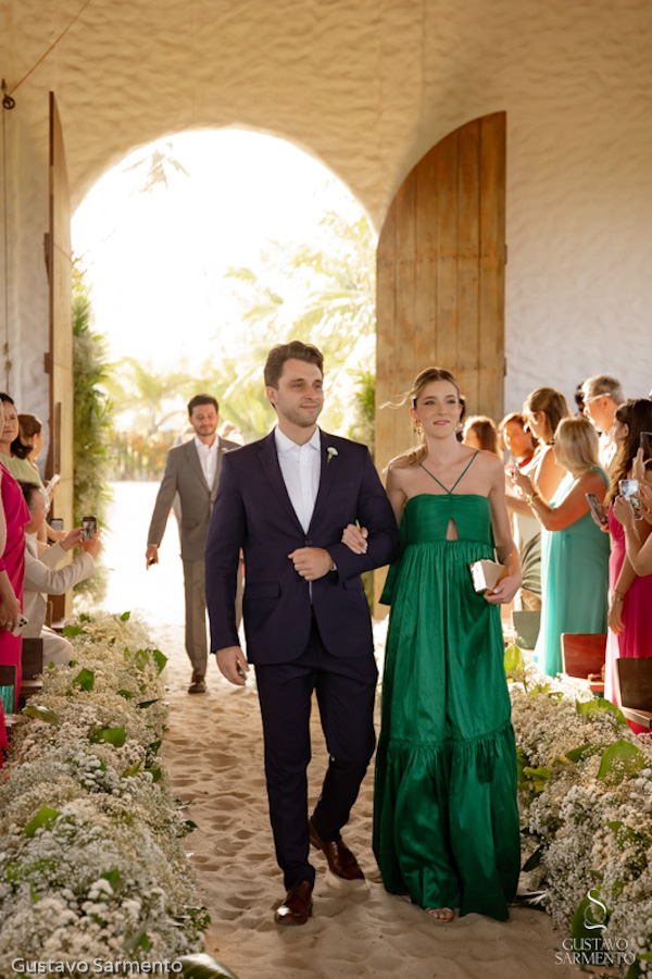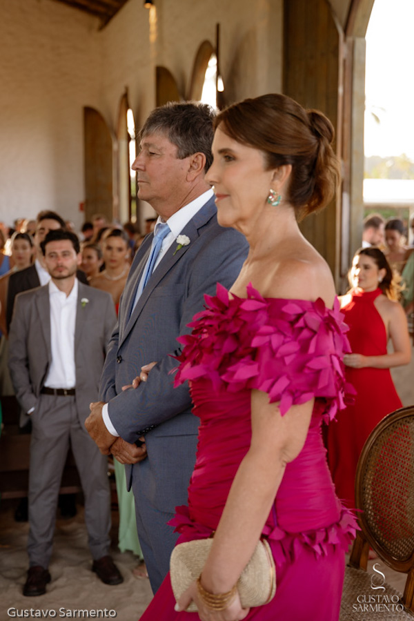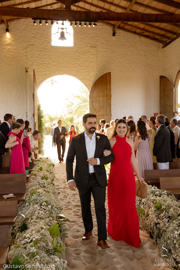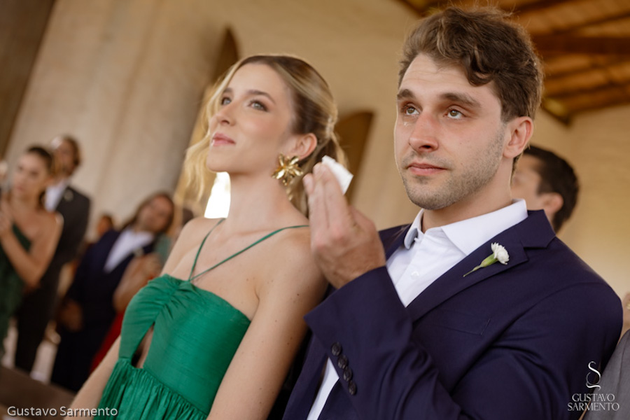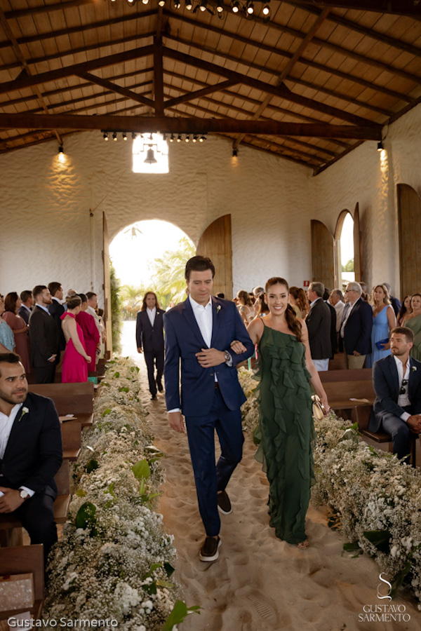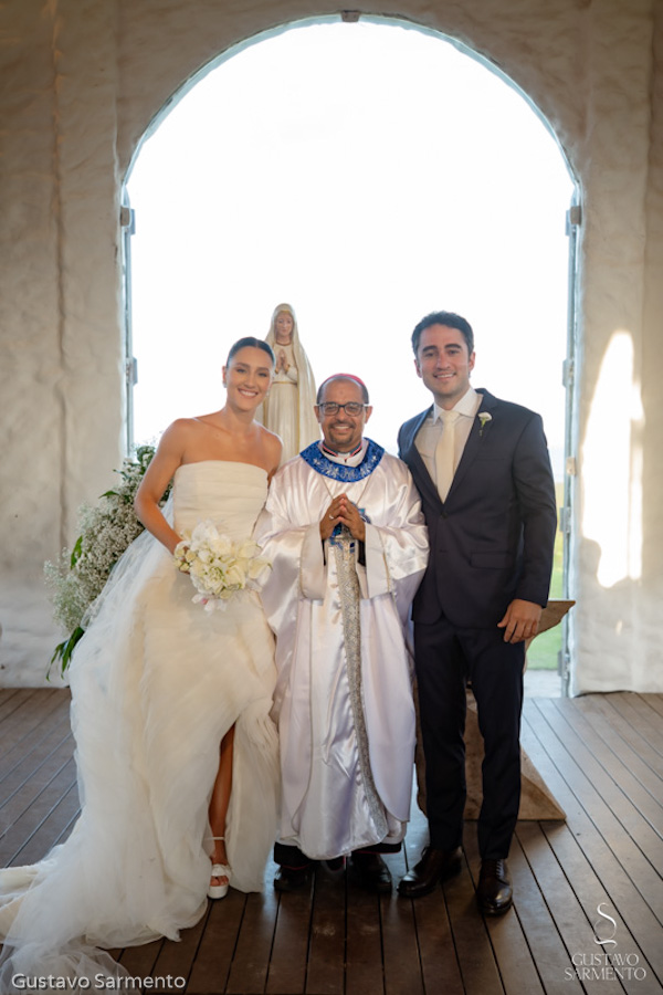 Encantadores, a dama Serena Nechar Sampaio e o pajem João Paulo Cansado Dib Ribeiro trouxeram doçura e graça ao cortejo. Os noivos deixaram todos boquiabertos: Duda, esplendorosa em modelo assinado pela renomada estilista Vera Wang, de São Paulo; Bernardo, impecável e elegantérrimo em terno Ricardo Almeida. Beleza, estilo e emoção se fundiram num momento que ficará para sempre na memória.