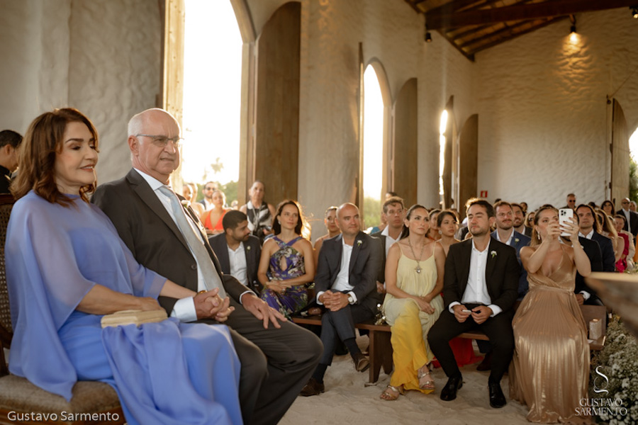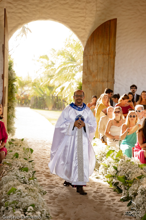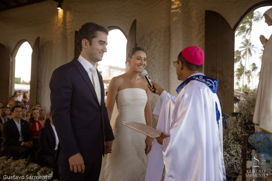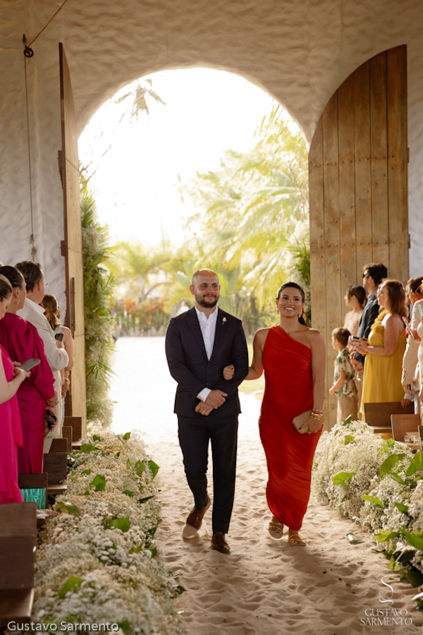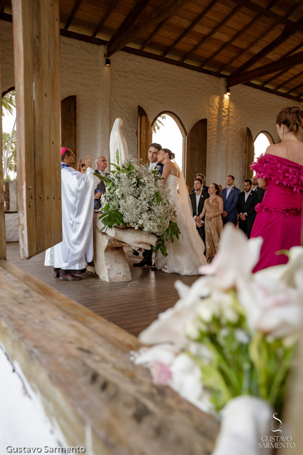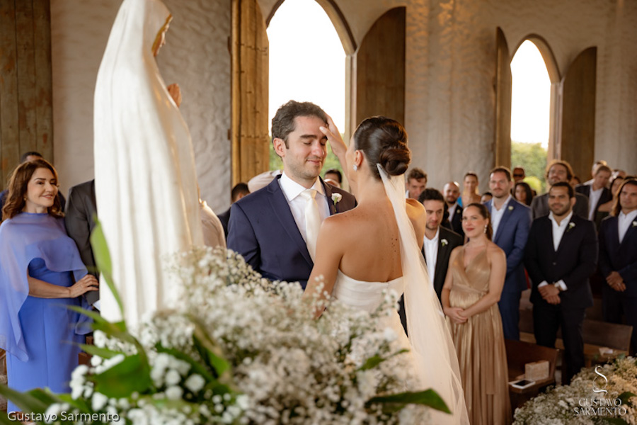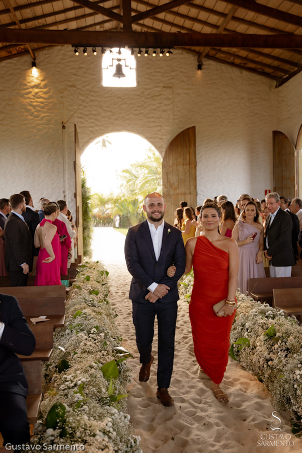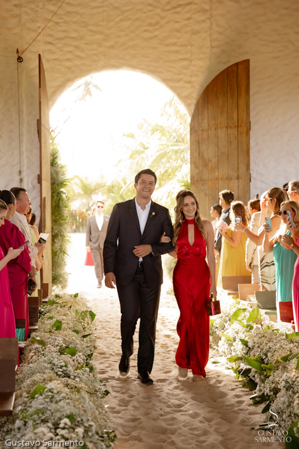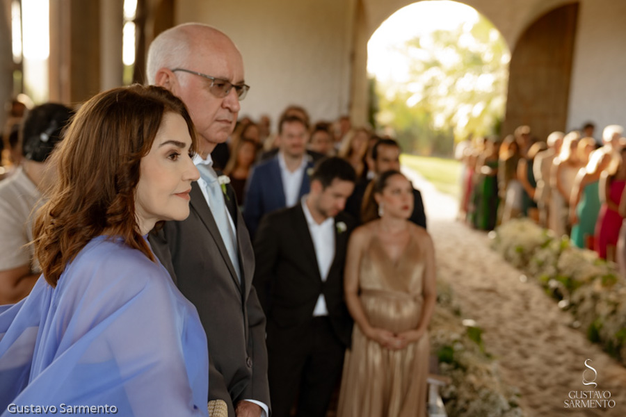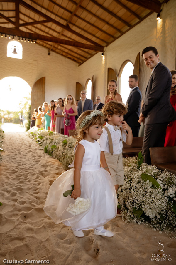 Encantadores, a dama Serena Nechar Sampaio e o pajem João Paulo Cansado Dib Ribeiro trouxeram doçura e graça ao cortejo. Os noivos deixaram todos boquiabertos: Duda, esplendorosa em modelo assinado pela renomada estilista Vera Wang, de São Paulo; Bernardo, impecável e elegantérrimo em terno Ricardo Almeida. Beleza, estilo e emoção se fundiram num momento que ficará para sempre na memória.