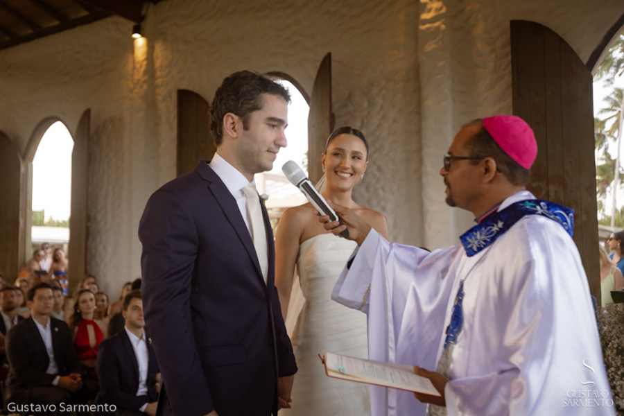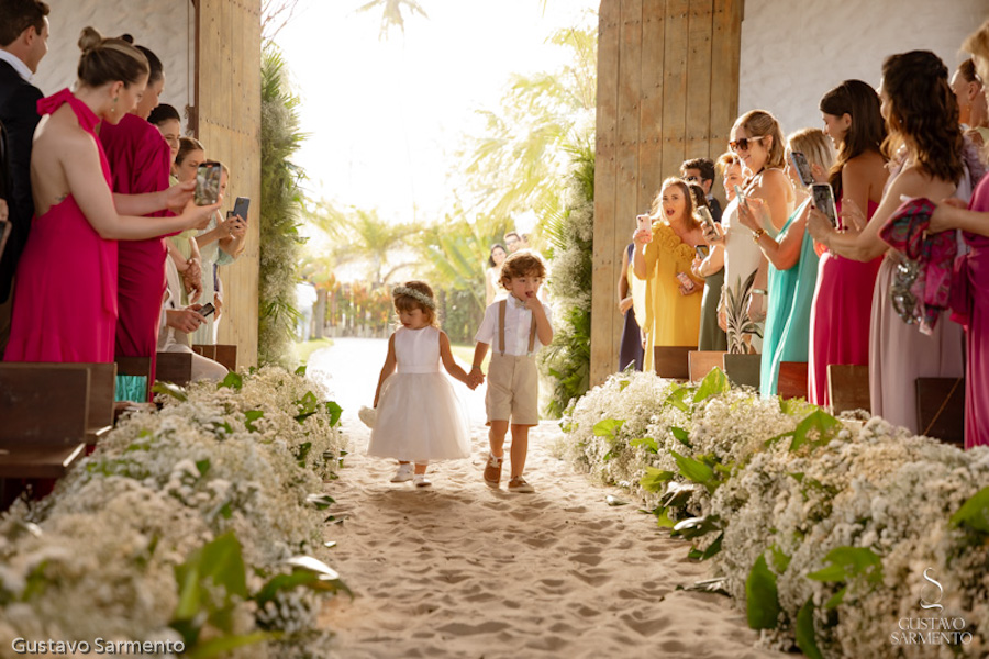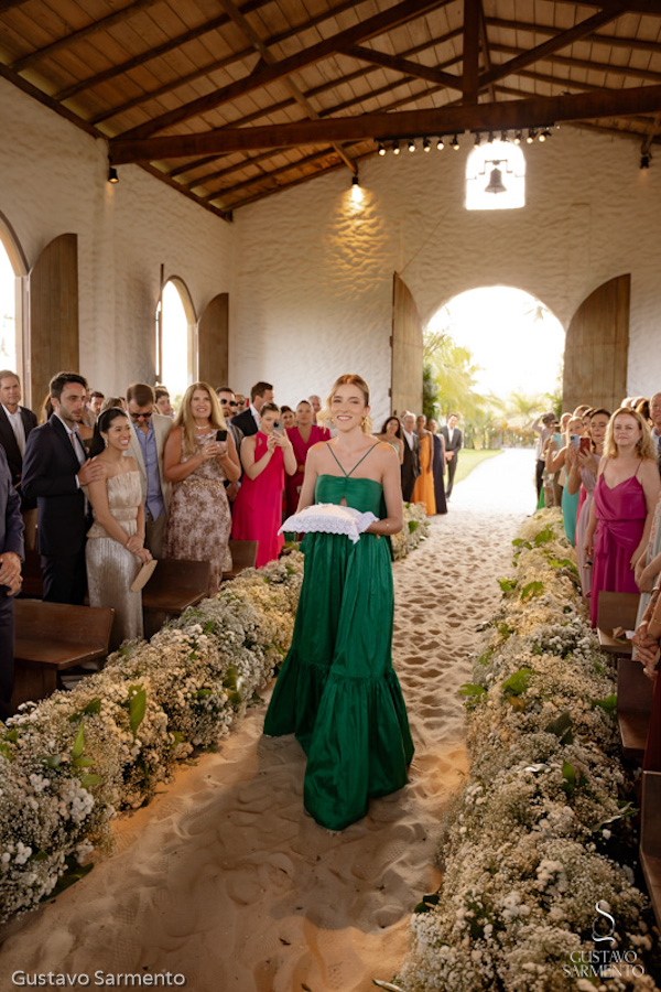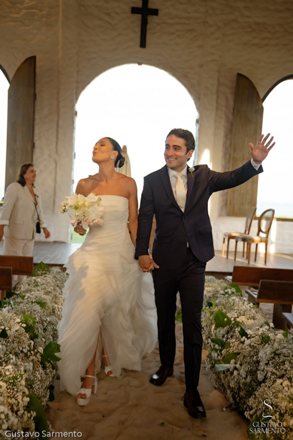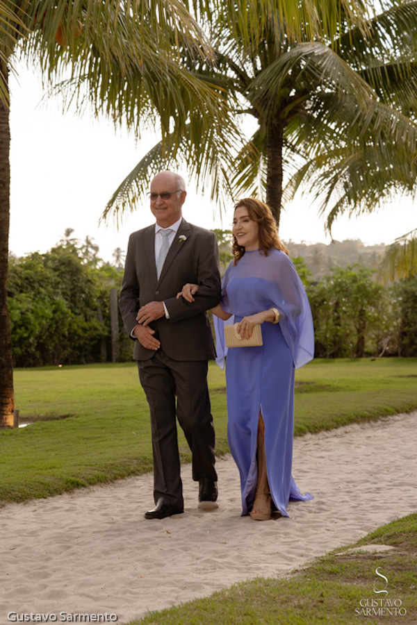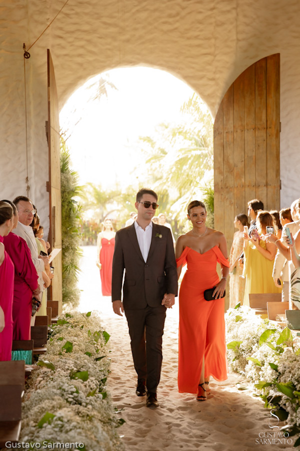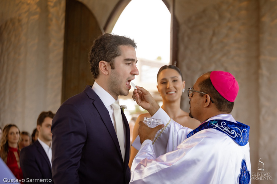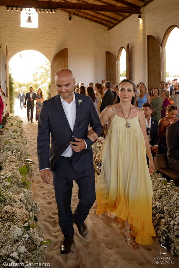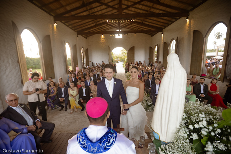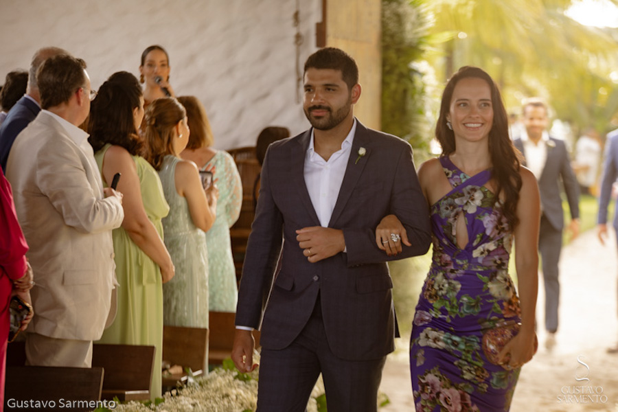 Encantadores, a dama Serena Nechar Sampaio e o pajem João Paulo Cansado Dib Ribeiro trouxeram doçura e graça ao cortejo. Os noivos deixaram todos boquiabertos: Duda, esplendorosa em modelo assinado pela renomada estilista Vera Wang, de São Paulo; Bernardo, impecável e elegantérrimo em terno Ricardo Almeida. Beleza, estilo e emoção se fundiram num momento que ficará para sempre na memória.