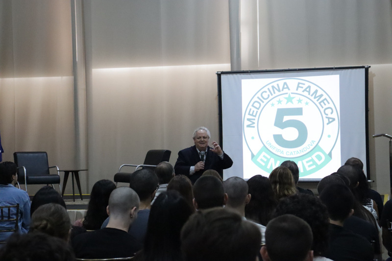 A área de Negócios apresentou parcerias firmadas com empresas de Catanduva e região, que oferecem benefícios aos estudantes. Encerrando a programação, o coordenador do Ciclo Básico e do Laboratório de Anatomia, Prof. Dr. Renato Rissi, apresentou o calendário e a organização acadêmica do primeiro ano do curso.