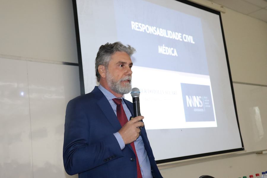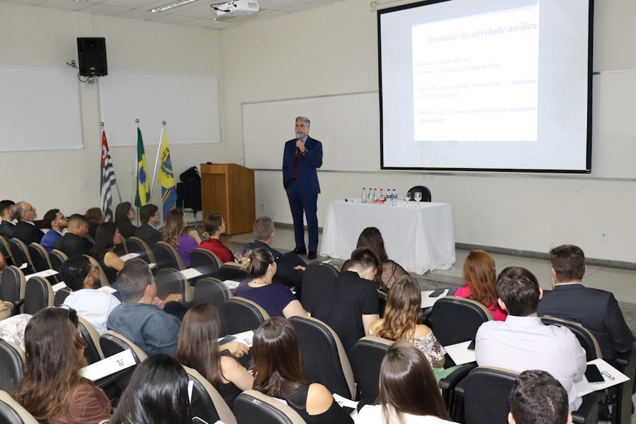 Na sequência, o advogado Dr. Cléber Vaccari, especialista em Direito Médico e membro da Comissão de Biodireito da OAB São José do Rio Preto, tratou do tema “Responsabilidade Civil Médica”. Ele fez paralelo entre a medicina antiga e a moderna, destacando como a evolução científica e o acesso à informação modificaram a relação entre médico e paciente. “Antes, a morte era vista como desígnio divino. Hoje, com a rápida difusão de informações, os pacientes chegam aos consultórios com diagnósticos prontos, muitas vezes baseados em achismos. A sociedade está mais consciente de seus direitos e isso aumenta também a judicialização da saúde”, observou o palestrante. Dr. Vaccari alertou sobre o crescimento de ações judiciais motivadas por erros médicos decorrentes de imprudência, negligência ou imperícia e reforçou a importância do diálogo e da clareza entre profissional e paciente. “O médico deve esclarecer o estado de saúde, os riscos do tratamento e respeitar as decisões do paciente. É uma relação que exige empatia, ética e uma visão interdisciplinar, muitas vezes com apoio psicológico e social”, concluiu.