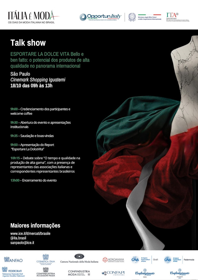 Na ocasião, serão apresentadas estimativas de aumento no comércio de moda da Itália com o Brasil, além de detalhes de cooperação entre a Itália e o Brasil que podem representar um modelo de sucesso para enfrentar os desafios globais.