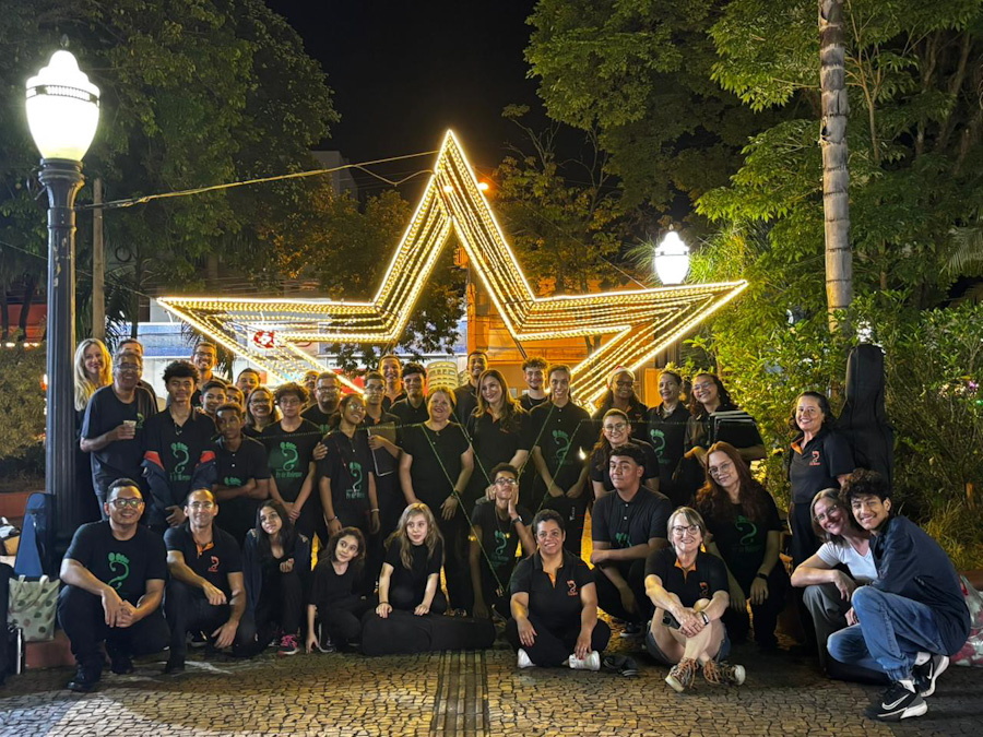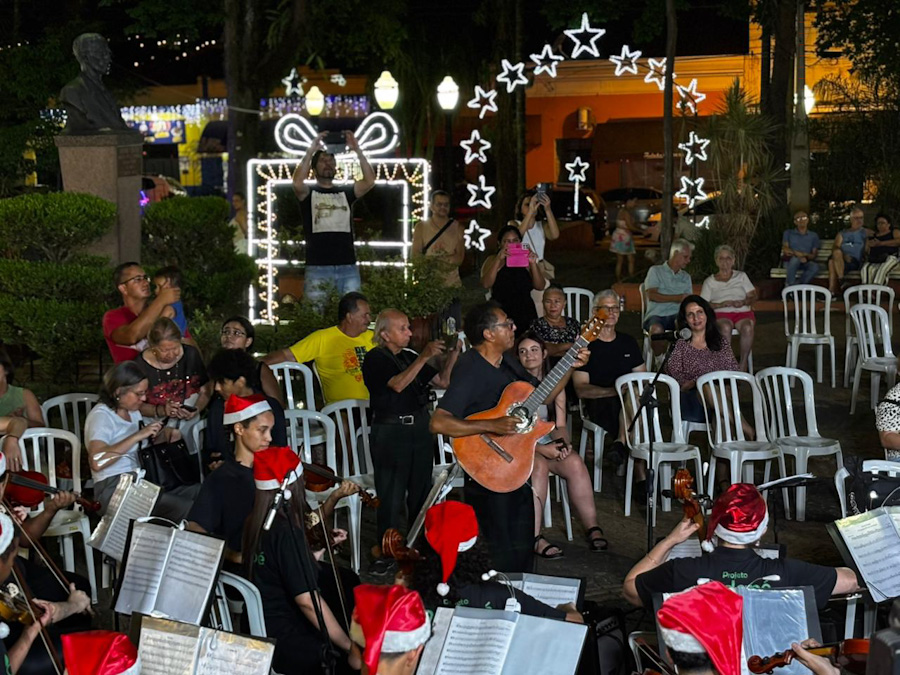 Na sexta-feira (05/12), o público acompanhou a emocionante apresentação da Escola de Música São Pedro, que levou ao palco um repertório natalino preparado especialmente para o evento. Famílias, alunos e visitantes lotaram a praça para prestigiar os jovens músicos da cidade.