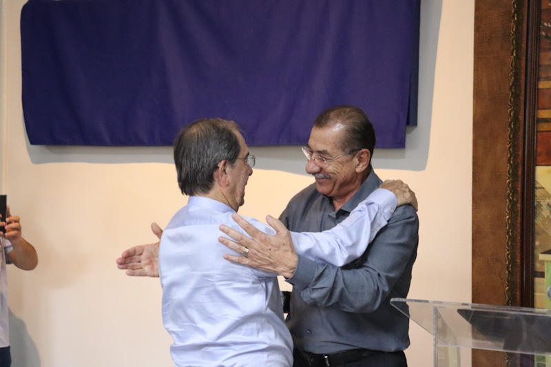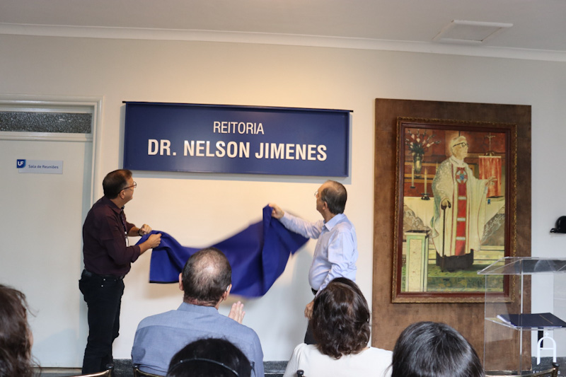 Reginaldo Lopes e Dr. Nelson Jimenes descerraram a placa que oficializa a homenagem, denominando o espaço administrativo em ‘Reitoria Dr. Nelson Jimenes’.