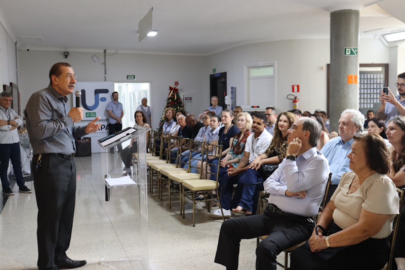 Em seu pronunciamento, Dr. Nelson Jimenes agradeceu a homenagem e destacou a importância do voluntariado, citando Padre Albino como referência em sua trajetória. O reitor também incentivou a continuidade do compromisso com ações voltadas ao bem comum e à missão institucional da Fundação. “Está dentro de mim fazer tudo que for possível para que se torne realidade a obra que nosso mentor edificou. Eu acho que depois de tantos anos, ainda é pouco, porque o ser humano tem uma força tão grande que todos nós aqui podemos fazer muito mais do que nós fazemos. Então vamos combinar uma coisa: vamos fazer um pouco mais pelo nosso semelhante, fazendo mais um pouco nós estamos inspirados na divindade suprema, em Deus. Muito obrigado a todos”, concluiu.