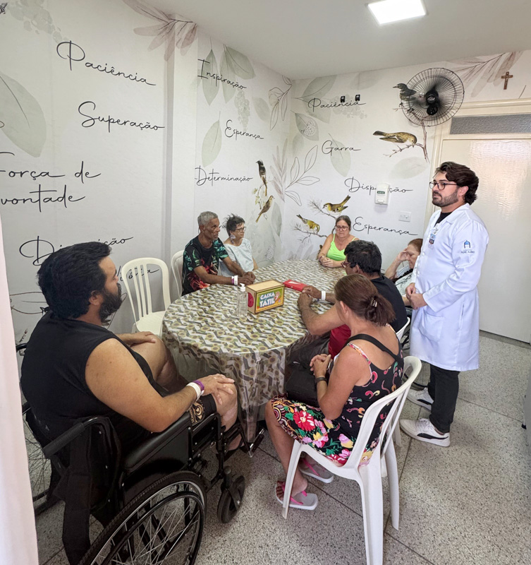 Em seguida, os serviços de Fisioterapia, Serviço Social, e de Nutrição, desenvolveram a dinâmica “Espaço Sensorial”, com foco na estimulação olfativa. “Os participantes foram vendados e convidados a identificar temperos apenas pelo cheiro. A atividade, lúdica e interativa, despertou risos, lembranças e sensações que foram compartilhadas”, contou Flaviane Afonso, coordenadora de Fisioterapia.