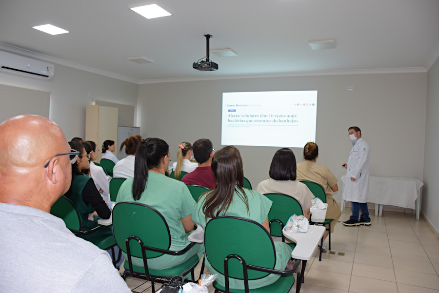 A programação contou com a participação do Dr. Arlindo Schiesari Júnior, médico infectologista e coordenador da Comissão de Controle de Infecção Hospitalar (CCIH), que conduziu uma palestra sobre as doenças que podem ser ocasionadas pela má higienização das mãos, destacando os riscos de contaminação cruzada e infecções associadas à assistência à saúde.
