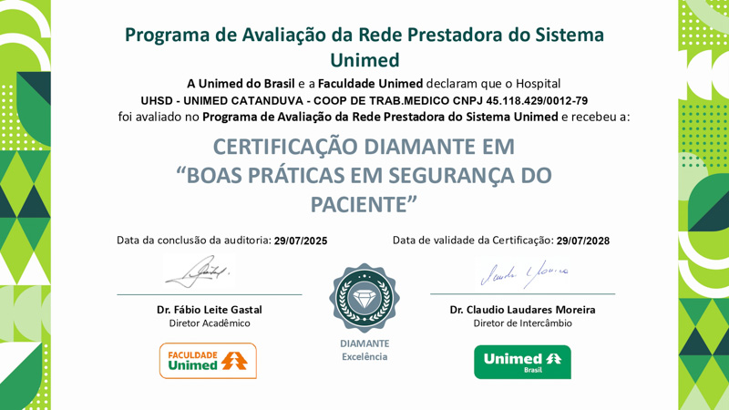 Para o presidente da Unimed Catanduva, Dr. José Renato Pizarro, essa conquista é coletiva. “O certificado Diamante – Excelência representa o empenho de toda a equipe do HUSD. É o reflexo do nosso jeito de cuidar, sempre buscando oferecer um atendimento de excelência e centrado no paciente. Essa conquista é de cada colaborador, médico cooperado e parceiro que acredita em nossa missão”, afirma.