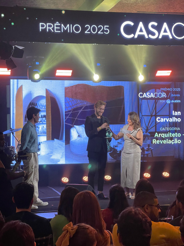 O arquiteto Ian Carvalho foi destaque na cerimônia do prêmio CASACOR Bahia 2025, nesta segunda-feira (1º), na Casa Nossa Senhora das Mercês, em Salvador. Ele recebeu o prêmio de Arquiteto Revelação, categoria estreante nesta edição, que reconhece os novos talentos do cenário baiano. A premiação trouxe novidades como o troféu inédito, desenvolvido pela Avatim em parceria com a designer Carol Gay, com formato de difusor de aromas inspirado na delicadeza de pétalas.