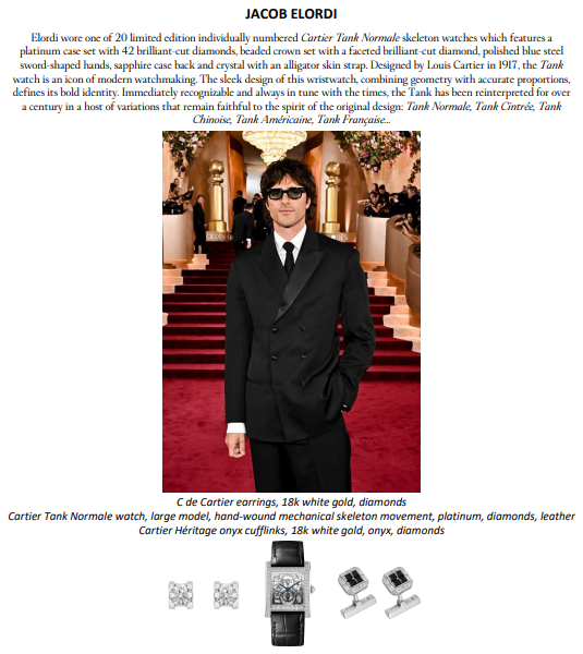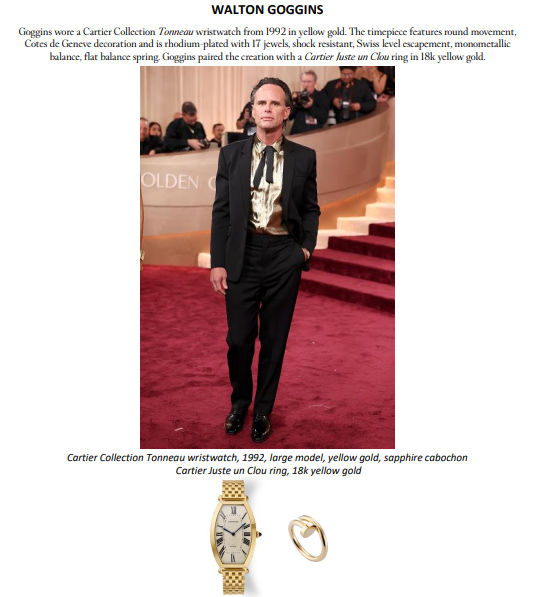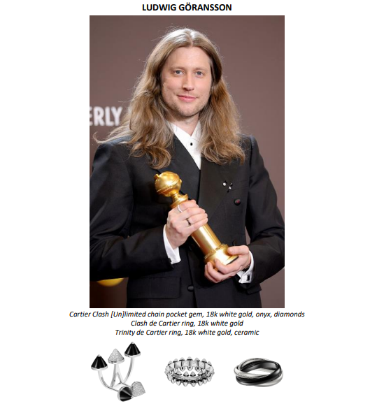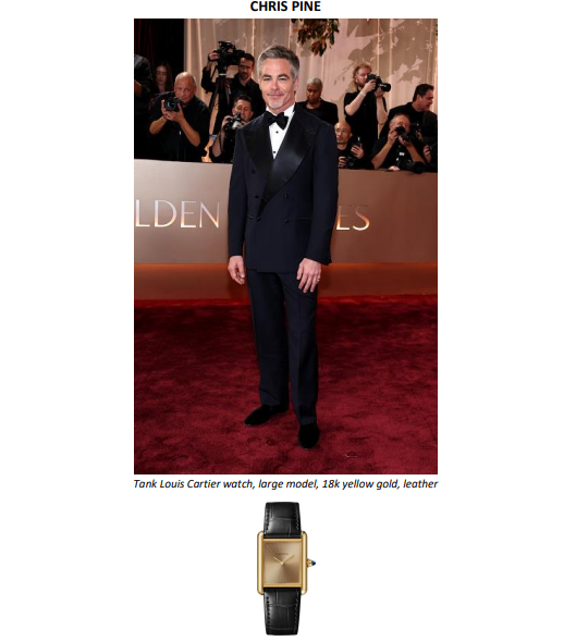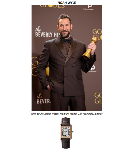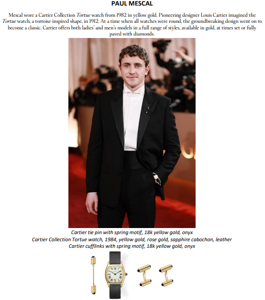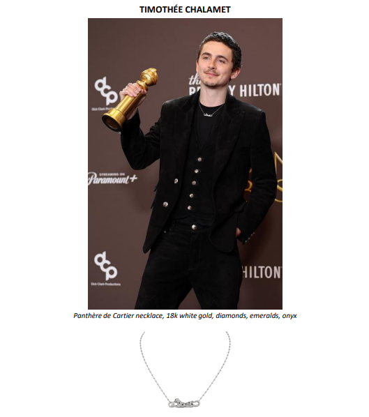 A noite também foi marcada pelas vitórias de Timothée Chalamet, vencedor de Melhor Ator em Filme – Comédia ou Musical por Marty Supreme, e de Hamnet, eleito Melhor Filme – Drama, protagonizado por Paul Mescal, ambos usando Cartier. Para a ocasião, Mescal escolheu prendedor de gravata e abotoaduras com motivo de mola, em ouro amarelo 18 quilates e ônix, além do relógio Cartier Collection Tortue (1984). Já Chalamet usou o colar Panthère de Cartier, em ouro branco com diamantes, esmeraldas e ônix.