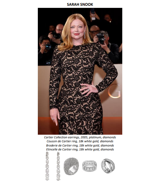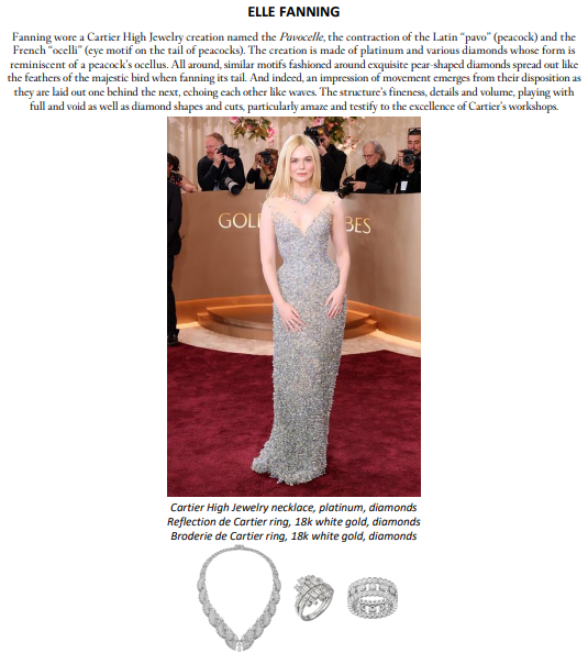 Elle Fanning marcou presença na cerimônia por suas indicações com Valor Sentimental, usando um colar de Alta Joalheria em platina com diamantes, o anel Reflection de Cartier em ouro branco 18 quilates com diamantes e o anel Broderie de Cartier, também em ouro branco 18 quilates com diamantes.