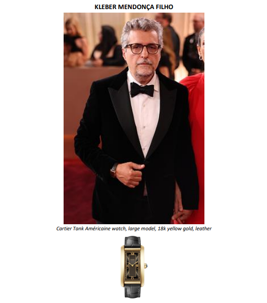 O cinema brasileiro teve destaque na noite com Kleber Mendonça Filho e Emilie Lesclaux, diretor e produtora de O Agente Secreto, vencedor do prêmio de Melhor Filme em Língua Não Inglesa. Para a ocasião, Kleber escolheu o relógio Tank Américaine de Cartier, em ouro amarelo 18 quilates com pulseira de couro, enquanto Emilie usou os brincos Reflection de Cartier, em ouro branco 18 quilates com diamantes, e a pulseira Panthère de Cartier, em ouro branco 18 quilates com diamantes, ônix e esmeraldas.