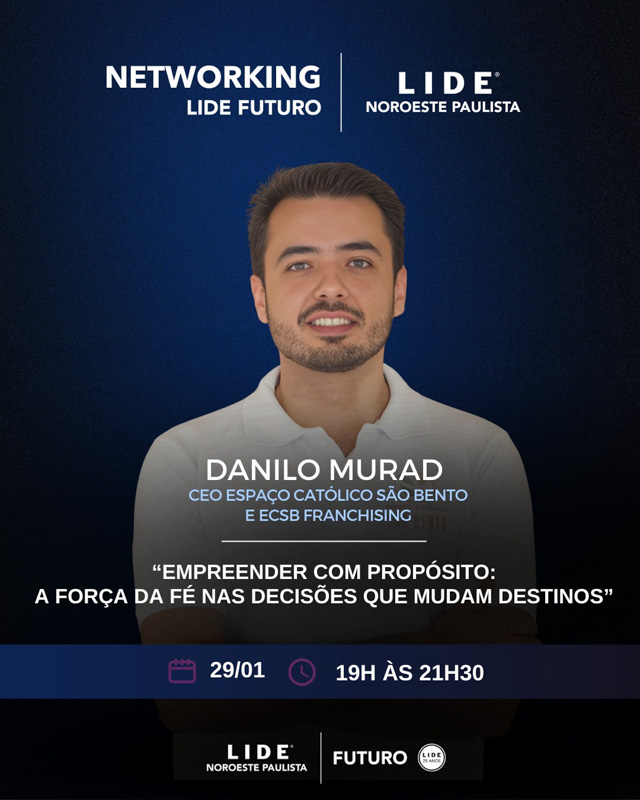 Já no dia 29/01 é a vez do LIDE Futuro abrir sua programação do novo ano. O primeiro encontro do segmento jovem terá a presença de Danilo Murad, CEO do Espaço Católico São Bento e da ECSB Franchising. Ele falará sobre “Empreender com propósito: a força da fé nas decisões que mudam destinos”.