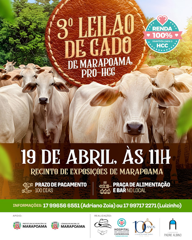 O Grupo Ação Entre Amigos promove no dia 19 de abril, a partir das 11 horas, no recinto de exposições, o 3º Leilão de Gado de Marapoama, evento que destinará 100% da renda ao Hospital de Câncer de Catanduva (HCC).