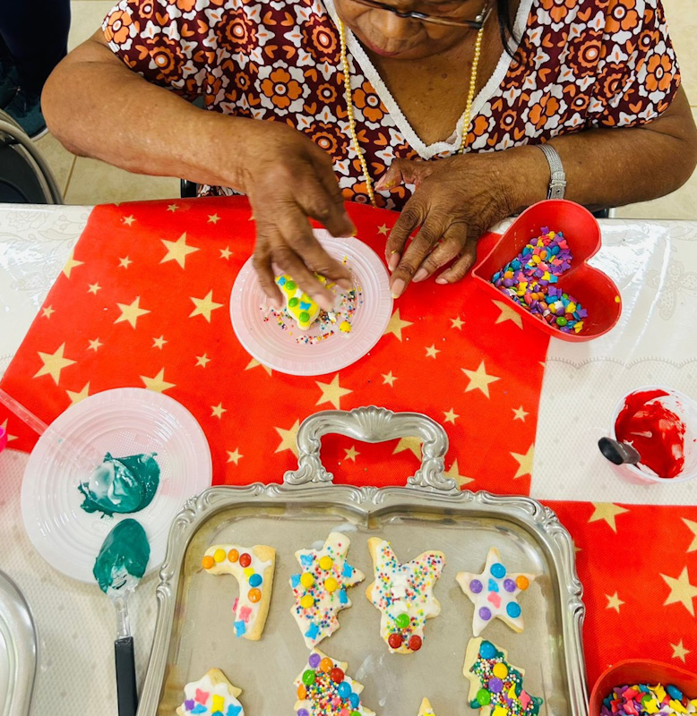 Durante a oficina, os participantes colocaram a “mão na massa” para decorar biscoitos típicos de Natal, em uma experiência lúdica que despertou memórias, emoções e sentimentos ligados às tradições natalinas. “Este tipo de ação proporciona diversão e estímulos importantes para o bem-estar físico, emocional e cognitivo das pessoas idosas”, disse Marina Rabay, educadora física da instituição.