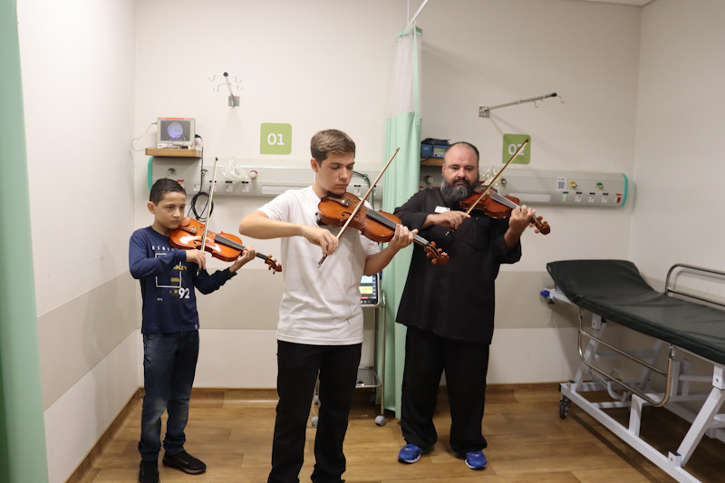 Um dos pontos altos da ação foi a participação da Orquestra Escola, projeto social patrocinado pela Unimed Catanduva. Integrantes do projeto acompanharam o Papai Noel tocando violino e interpretando músicas natalinas, levando ainda mais emoção aos corredores do hospital. O som delicado dos instrumentos criou uma atmosfera acolhedora, proporcionando momentos de pausa, reflexão e alegria para todos que acompanharam a apresentação.