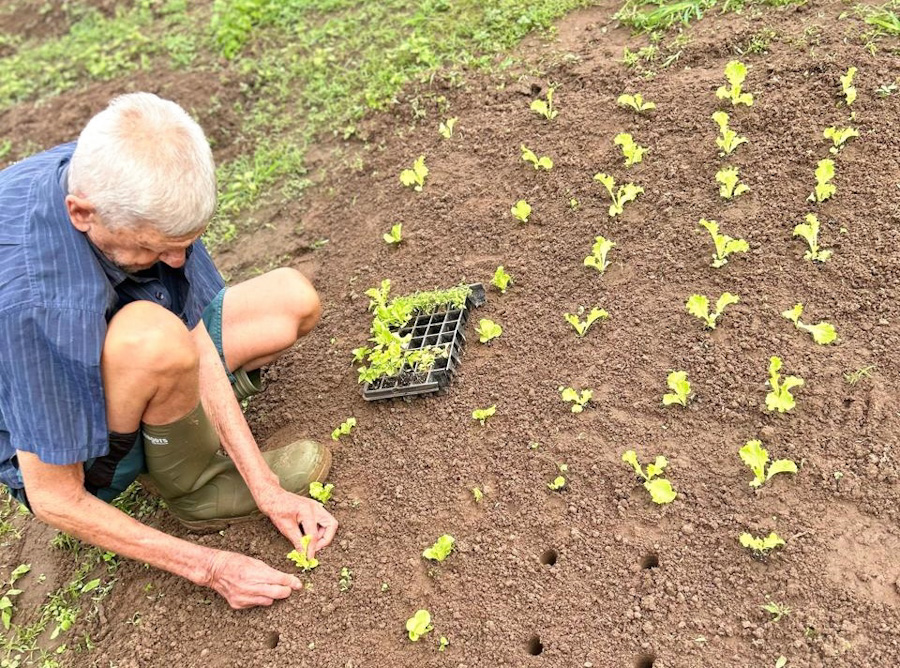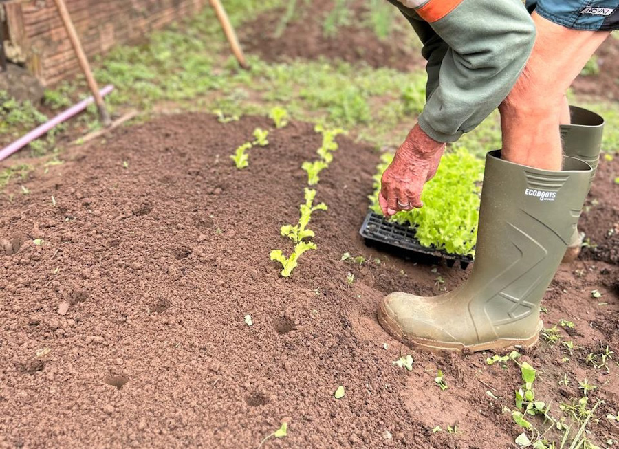 O morador J.E.P.G., de 75 anos, vive no Recanto desde 1999 e trouxe sua rica bagagem de conhecimentos do campo. Com entusiasmo, ele compartilhou técnicas, histórias e saberes adquiridos em décadas de trabalho em sítio na cidade de Ariranha. Seu envolvimento serviu de inspiração para os demais, tornando-se referência entre os moradores.