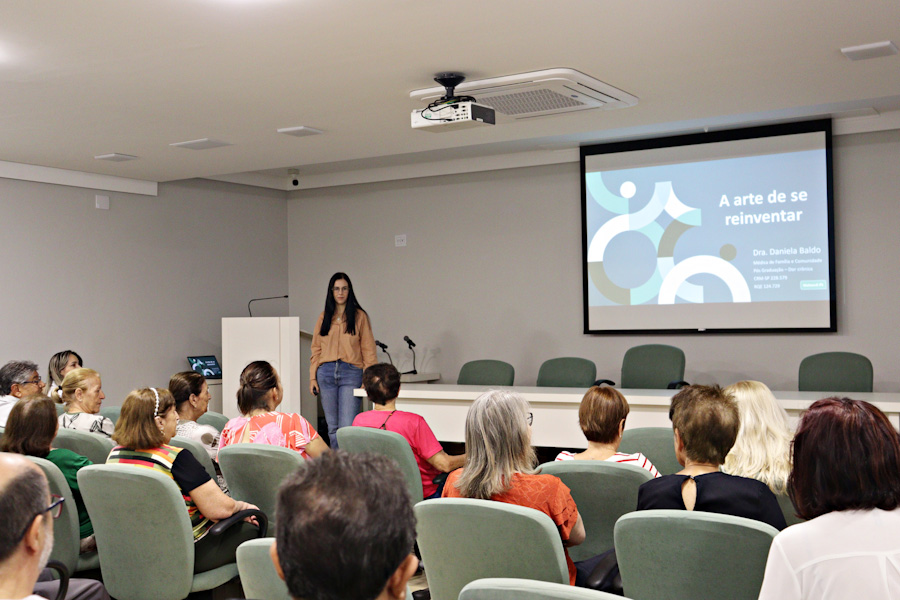 Durante o encontro, a Dra. Daniela Baldo, médica da Medicina Preventiva, abordou o tema “Mudanças no corpo e na rotina: como se reinventar nessa fase da vida”, promovendo uma conversa leve e interativa.