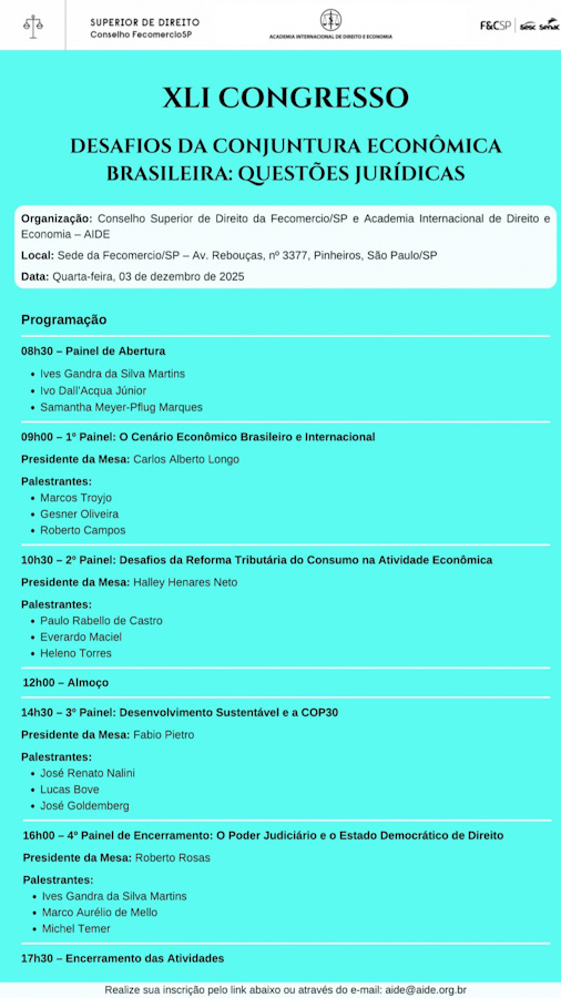 A Academia Internacional de Direito e Economia (AIDE) e o Conselho Superior de Direito da FecomercioSP, presidido pelo jurista Ives Gandra da Silva Martins, promovem no dia 3 de dezembro (quarta-feira) o XLI Congresso Desafios da Conjuntura Econômica Brasileira: Questões Jurídicas Correlatas. O evento fará um balanço dos impactos jurídicos e econômicos nos fatos mais relevantes que moldaram o cenário nacional no ano de 2025.